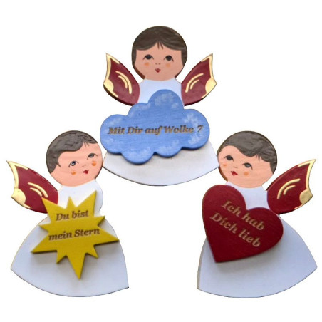 Magnetpinset 3 Engel mit Herz, Stern, Wolke, rote Flügel, lasiert und handbemalt, mit Sprüchen
